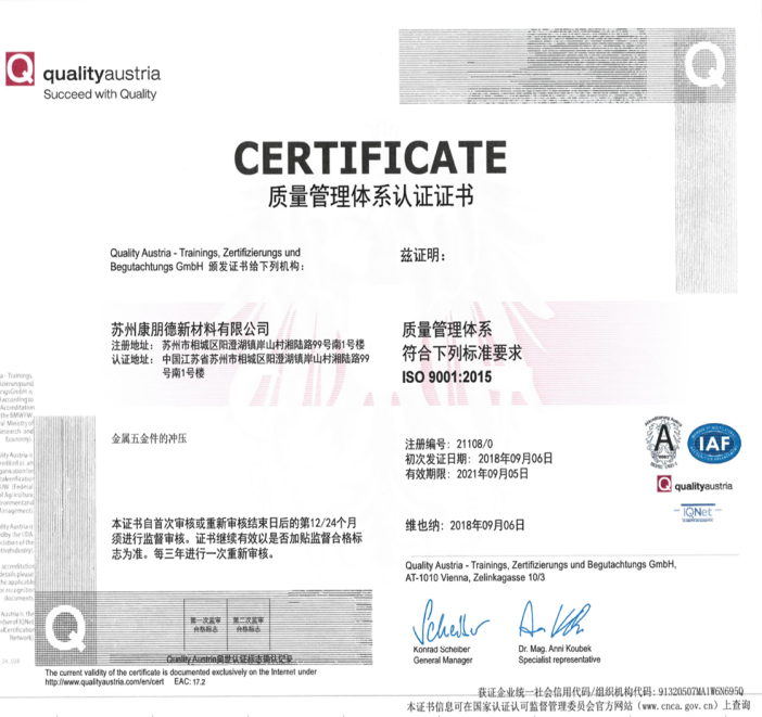為了更好的使產(chǎn)品質(zhì)量得到控制,使顧客更加滿(mǎn)意,內(nèi)部管理水平得以提升,降低企業(yè)的管理成本并提高公司的工作效率,蘇州康朋德大力在內(nèi)部推行ISO體系,讓公司管理更加系統(tǒng)和規(guī)范。并于2018年9月6日取得了認(rèn)證。